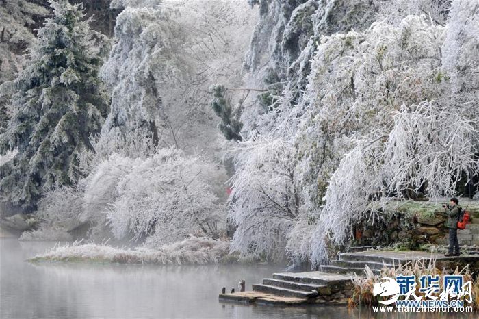 11月24日,游客在江西庐山拍摄雾凇景色。近日,受强冷空气影响,江西庐山迎来降雪,并出现雨凇、雾凇等景观,苍翠的山岭银装素裹,分外妖娆。新华社发(胡国林摄)