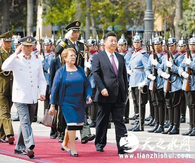 11月22日,国家主席习近平在圣地亚哥同智利总统巴切莱特举行会谈。这是会谈前,习近平出席巴切莱特在宪法广场举行的隆重欢迎仪式。新华社记者王晔摄