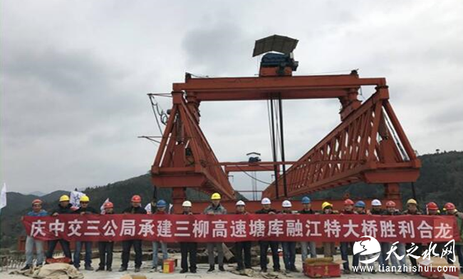 (记者 常魁星 通讯员 张丽 祁云翠)“塘库融江架桥长,主跨悬壁现浇梁;感恩节时梁合龙,年底通车气势强。”11月24日,上午十一点三十分,随着最后一片T梁精准就位,广西三柳高速公路重点控制性工程—塘库融江特大桥胜利合龙,标着中交三公局三柳高速公路3标全线2696片梁板全部架设完成,3标主线桥梁实现全幅架通,是“百日大干”施工竞赛赢取的又一节点胜利,为年底通车奠定了坚实基础。