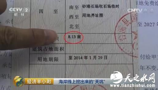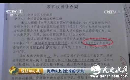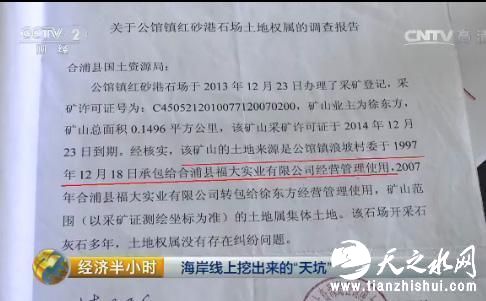 广西北海市合浦县在海岸线上挖矿采石的近20家采石场,采矿手续是否齐全呢?记者随即找到了合浦县国土资源局,相关负责人向记者提供了一份“关于公馆镇红砂港石场土地权属的调查报告”,里面提到“该矿山的土地来源是公馆镇浪坡村委于1997年12月18日承包给合浦县福大实业有限公司经营管理使用的”字样。