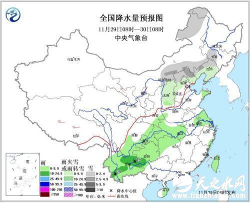 11月29日08时至11月30日08时,内蒙古东北部和中部偏南地区、山西中北部、河北北部、北京、黑龙江北部等地的部分地区有小到中雪或雨夹雪;陕西东南部、西南地区东部和南部、江汉西部和南部、江南西北部、江淮东部及海南岛东部、台湾等地有小到中雨。内蒙古中西部、甘肃西部等地的部分地区有4~5级风。台湾海峡、南海北部和中部有7~8级、阵风9~10级的东北或偏北风。