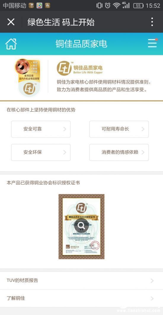 首先,信息平台会告诉你这款家用电器到底哪个核心零部件使用了铜材料,以及使用铜材料后,这款产品具备了哪些优良品质,例如,安全可靠、耐用寿命长、安全环保等。此外,铜佳标识链接的信息平台会展示该型号产品获得的“国际铜业协会标识授权证书”和“第三方权威检测机构TUV的材质检测报告”。