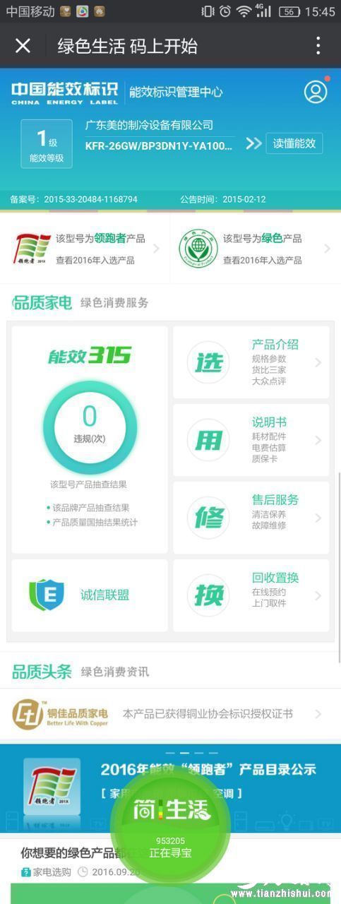 扫描二维码,消费者可以进入能效标识信息平台,获取用能产品的能效信息、能效备案号、产品能效质量抽查情况,核实家电质量。