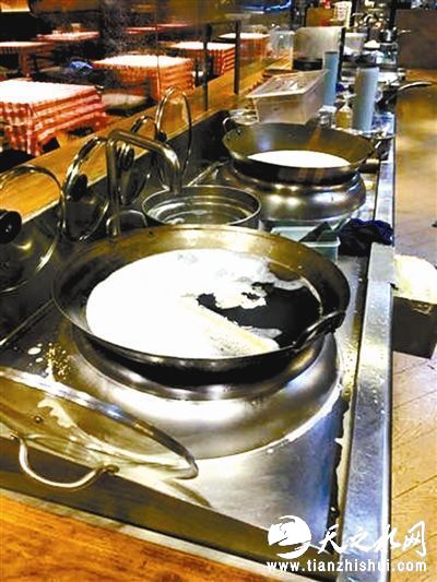 对于女士疑问锅内盛放的泡沫水是何物,负责人解释,锅里泡抹布的是洗涤灵水。他表示,锅内不会有脏物残留,“打扫结束后,店里会对锅具和抹布用次氯酸钠消毒液进行统一消毒。”