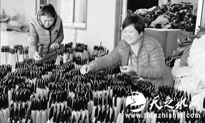 11月28日,在山东省无棣县电商淘宝第一村——海丰街道付家村,村民张书华(右)正在忙着加工在淘宝上售卖的雨伞。