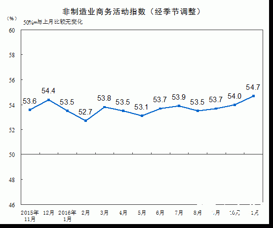 人民网北京12月1日电(杨曦)国家统计局今日发布数据显示,2016年11月份,中国非制造业商务活动指数为54.7%,比上月上升0.7个百分点,连续三个月上升,为2014年7月以来的高点,继续保持平稳较快增长。