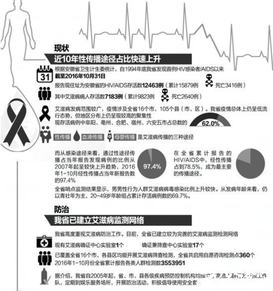 据安徽商报消息2016年12月1日是第29个“世界艾滋病日”,今年的宣传主题是“携手抗艾,重在预防”。记者从安徽省卫生计生委获悉,近10年来,我省通过性途径传播占新发病病例的比例呈快速上升趋势,而今年前10个月,经性传播占新报告数的97.4%,发病群体仍以青壮年为主体。(陈旭邱向峰汪漪张永欧恺)