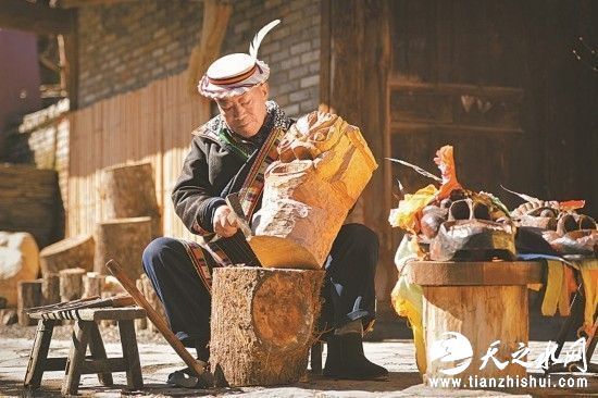 白马藏族非遗传承人旭仕修正在雕刻曹盖头像。平武县文化旅游局供图
