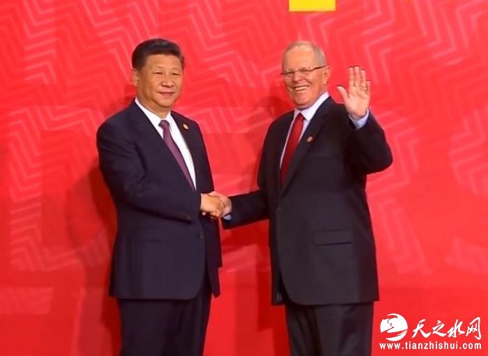 习近平同其他与会领导人依次抵达,受到秘鲁总统库琴斯基的热情迎接。