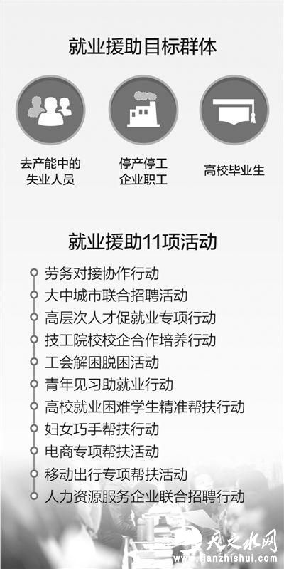 去产能任务重、停产职工多、失业风险上升的就业困难城市和企业,是本轮就业援助的重点。去产能中的失业人员、停产停工企业职工、高校毕业生,是本轮就业援助的目标群体。“我们将通过拓宽门路、援助脱困、信息对接、联合招聘、培训见习等帮扶措施,缓解东北等困难地区就业压力。”上述负责人表示。据了解,就业援助工作具体包括11项活动:劳务对接协作行动、大中城市联合招聘活动、高层次人才促就业专项行动、技工院校校企合作培养行动、工会解困脱困活动、青年见习助就业行动、高校就业困难学生精准帮扶行动、妇女巧手帮扶行动、电商专项帮扶活动、移动出行专项帮扶活动、人力资源服务企业联合招聘行动。