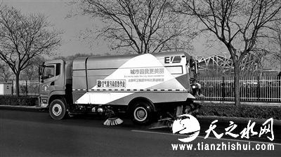 昨天,北京环卫集团机扫公司员工驾驶金耀蓝纯电动洗地车在北四环辅路进行道路作业