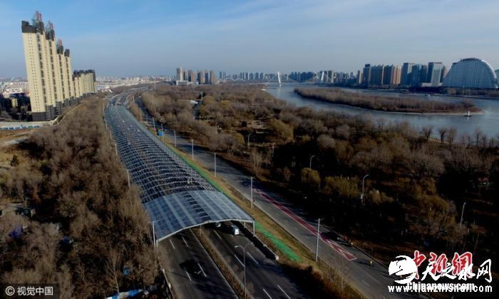12月5日,辽宁省沈阳市,千米全封闭式降噪“路罩”悄现沈阳南二环,引起市民强烈好奇心。据了解,该降噪“路罩”斥6000万巨资,东北首个,全长近千米,横跨26.5米,高5—8米,采用钢结构框架,配以金属复合吸音板、采光隔音板及通风金属格栅板,三类功能性屏体相结合的表面材料组成。图片来源:视觉中国