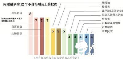 在这些不合格网售食品中,水果及其制品以14批次居“黑榜”之首,占比超过16%;二氧化硫为违规添加最多的项目,共涉及8批次产品;在电商渠道方面,超九成问题食品来自综合类电商平台,其中中粮我买网的自营食品也有上榜;而在今年6月抽检上榜的雅贝氏婴儿配方奶粉有10项不合格,居单一产品上榜问题数量之首。