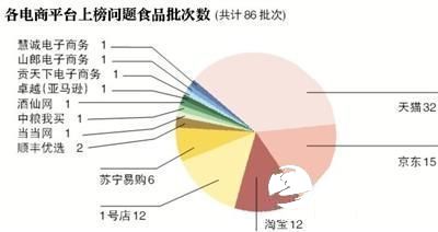 在86批次不合格网售食品中,有82批次来自天猫、京东、淘宝、1号店、苏宁易购、顺丰优选、当当网、卓越亚马逊等综合类电商平台,占比约95%。另有1批次不合格食品来自酒仙网。其中,天猫有32批次上榜,排在其后的为京东商城,共涉及15批次不合格食品。淘宝网和1号店则分别有12批次不合格食品上榜。