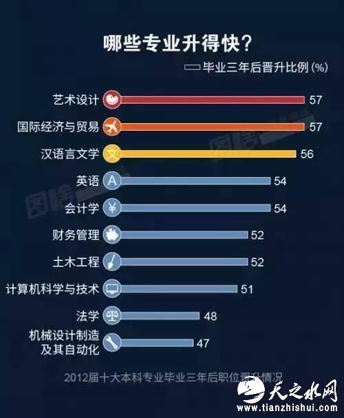 晋升较快的专业排名则和前两份大不相同。艺术设计、国际经济与贸易、汉语言文学位列前三;而在收入、就业率中稳居榜首的计算机科学与技术,则同法学、机械设计制造及其自动化,位居末尾。