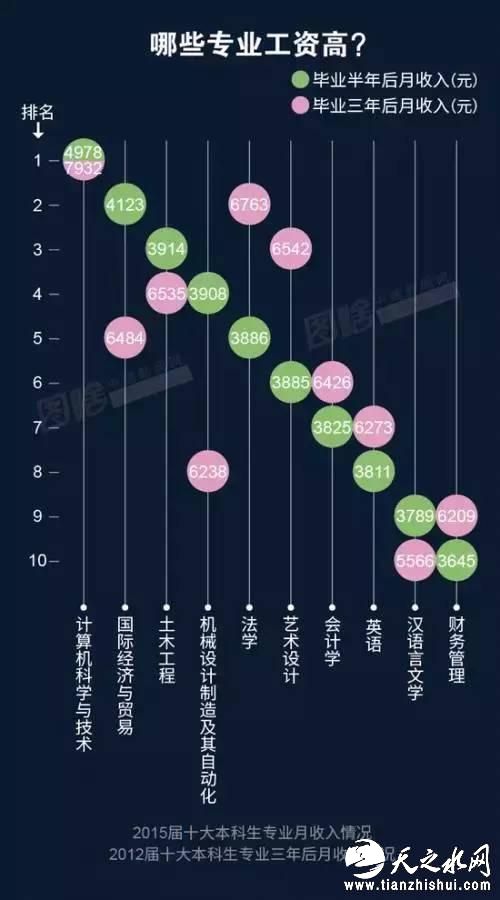 ★离职率:在十大专业中,土木工程专业离职率低,三年内更换雇主数少,是最为稳定的专业。国际经济与贸易与艺术设计专业相对最不稳定。