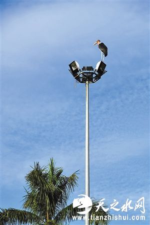 在动物喷泉广场,秃鹳落在高高的灯柱上。