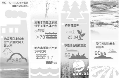 规划提出约束性和预期性指标,其中约束性指标12项,分别是地级及以上城市空气质量优良天数比率、细颗粒物未达标地级及以上城市浓度下降、地表水质量达到或好于Ⅲ类水体比例、地表水质量劣Ⅴ类水体比例、森林覆盖率、森林蓄积量、受污染耕地安全利用率、污染地块安全利用率,以及化学需氧量、氨氮、二氧化硫、氮氧化物污染物排放总量减少。