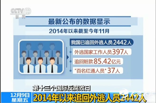 中央反腐败协调小组国际追逃追赃工作办公室最新公布的数据显示,2014年以来,截至今年11月,我国已追回外逃人员2442人,其中外逃国家工作人员397人,追回赃款85.42亿元,“百名红通人员“37人。
