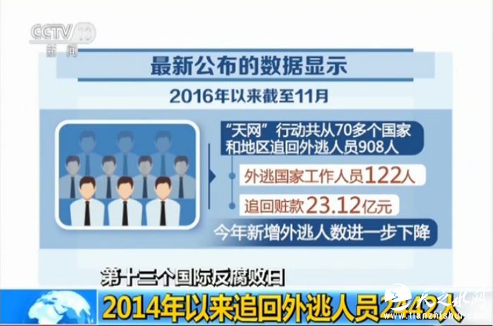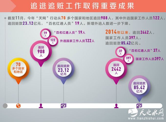 从今年的数据来看,截至11月,“天网”行动共从70多个国家和地区追回外逃人员908人,其中外逃国家工作人员122人,追回赃款23.12亿元。今年新增外逃人数进一步下降。