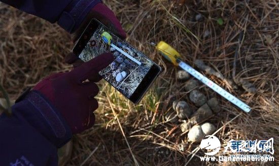 猫盟在晋中太行山区发现华北豹的粪便,猫盟成员黄巧雯用标尺做参照并拍照记录(11月13日摄)。新华社记者陶希夷摄