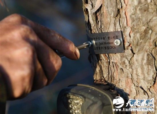 老豹子队成员程永香在红外触发相机上方钉上“给豹子买牛排”爱心机位的牌子(11月14日摄)。新华社记者陶希夷摄