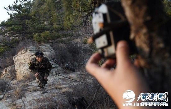 在晋中太行山区,老豹子队成员程永香伏低身体模仿豹子的姿态,以帮助蒋航调整红外触发相机的拍摄角度(11月14日摄)。新华社记者陶希夷摄