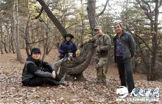 在晋中太行山区,猫盟豹项目负责人宋大昭(右二)、传播和筹款员黄巧雯(左二)、老豹子队队长魏栓兵(右)和志愿者蒋航在巡山时合影(11月13日摄)。新华社记者陶希夷摄
