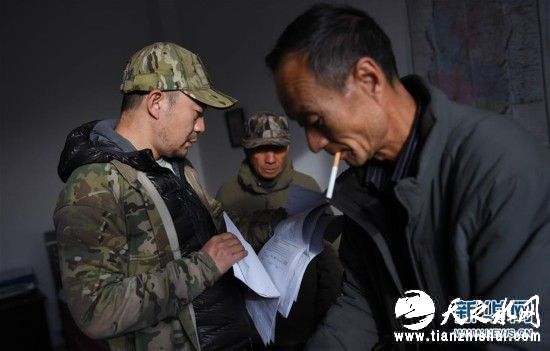 在山西晋中和顺县马坊乡,宋大昭(左)在翻看马坊乡乡长范新国(右)交给他的豹袭击家畜的材料(11月14日摄)。新华社记者陶希夷摄