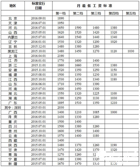 全国各地月最低工资标准公布:上海最高青海最低 2016-12-13 15:50 我要评论0 人民网北京12月13日电人社部网站今日公布截止2016年12月以来全国各地区月最低工资标准情况。全国各地区月最低工资第一档中上海最高,为2190元,深圳(2030元)与天津(1950元)分列第二、三位,青海最低,1270元。 微笑 流汗 难过 羡慕 愤怒 流泪 复制网址 打印 收藏 0
