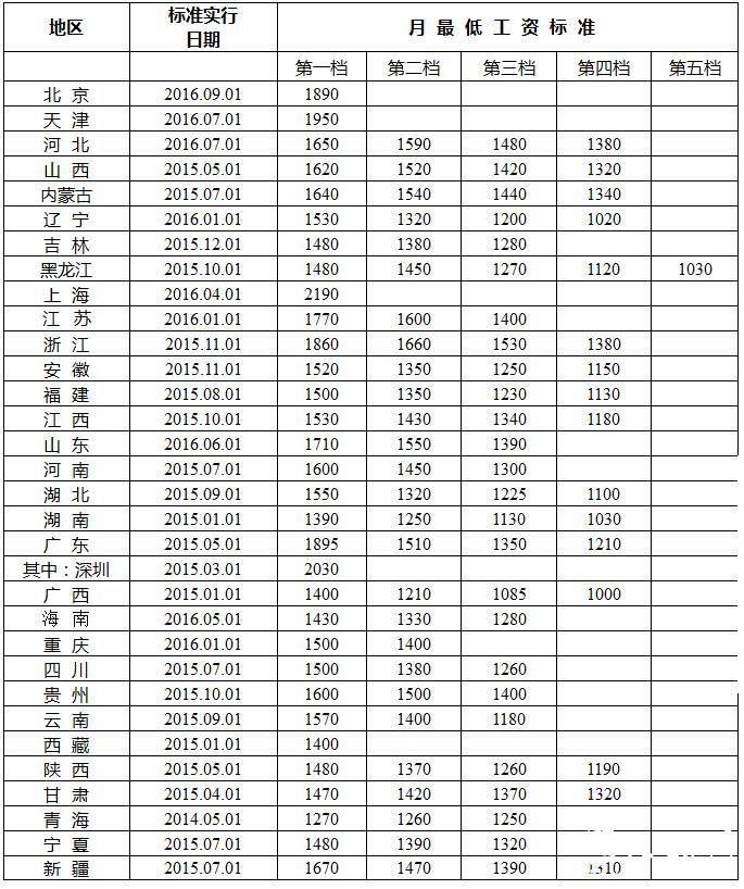 全国各地区月最低工资标准情况,第一档,上海最高,为2190元。深圳(2030元)与天津(1950元)分列第二、三位。