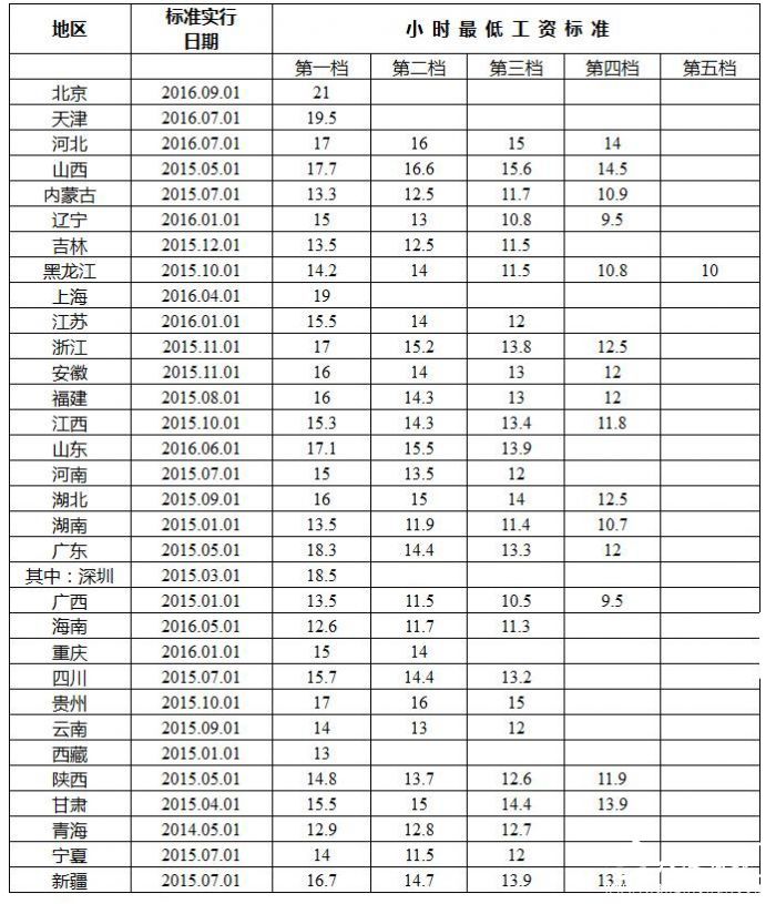 第一档小时最低工资标准,北京最高,为21元。天津(19.5元)与上海(19元)分列第二、三位。
