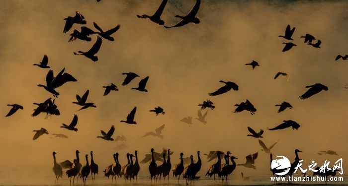冬日晨雾中的黑颈鹤(摄于拉萨市林周县虎头山水库)。新华社记者普布扎西摄