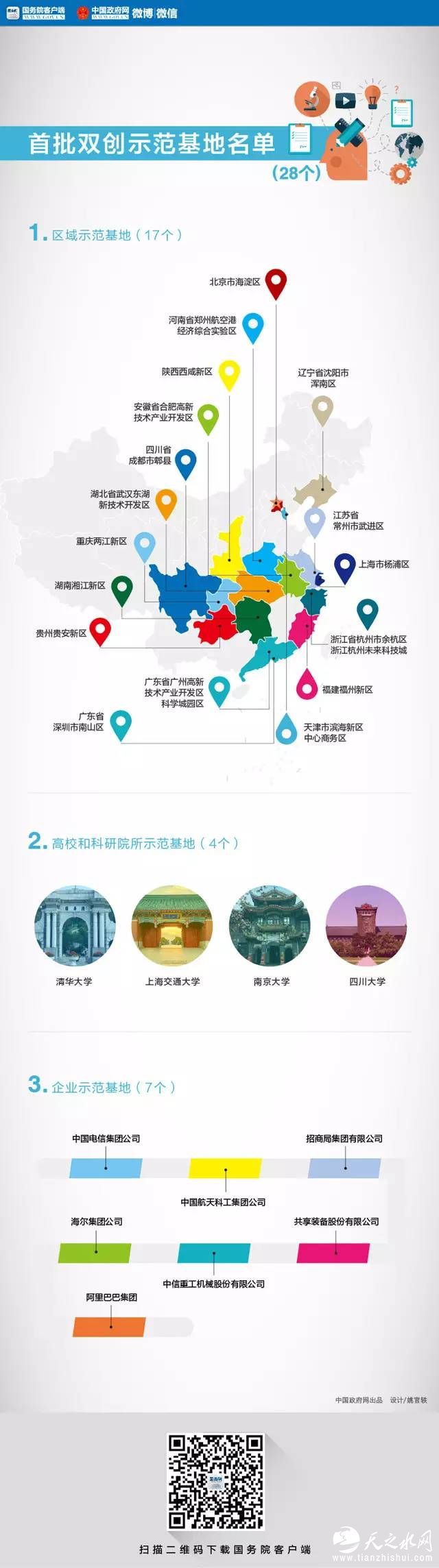 2016年5月,国务院办公厅印发《关于建设大众创业万众创新示范基地的实施意见》。《意见》指出,支持双创示范基地探索创新、先行先试,在拓宽市场主体发展空间、强化知识产权保护、加速科技成果转化、加大财税支持力度、促进创业创新人才流动、加强协同创新和开放共享等方面加大改革力度。到2018年底前,建设一批高水平双创示范基地,培育一批具有市场活力的双创支撑平台。《意见》确定了首批共28个双创示范基地,包括北京市海淀区等17个区域示范基地、清华大学等4个高校和科研院所示范基地、海尔集团公司等7个企业示范基地。