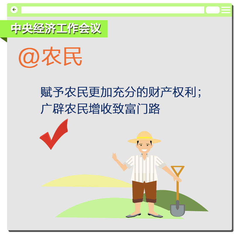 【红包】深入推进农业供给侧结构性改革。深化农村产权制度改革,明晰农村集体产权归属,赋予农民更加充分的财产权利。统筹推进农村土地征收、集体经营性建设用地入市、宅基地制度改革试点。广辟农民增收致富门路。