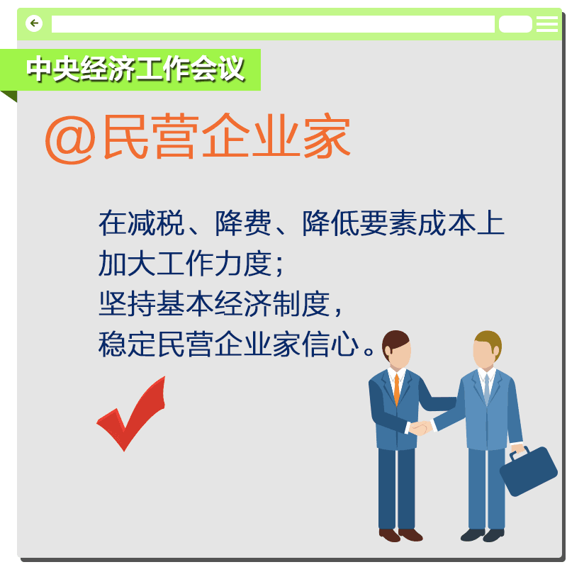 【红包】要在减税、降费、降低要素成本上加大工作力度。要坚持基本经济制度,坚持社会主义市场经济改革方向,坚持扩大开放,稳定民营企业家信心。