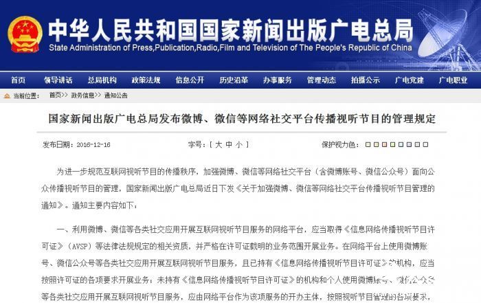 16日,国家新闻出版广电总局在官网上发布关于微博、微信等网络社交平台传播视听节目的管理的通知。