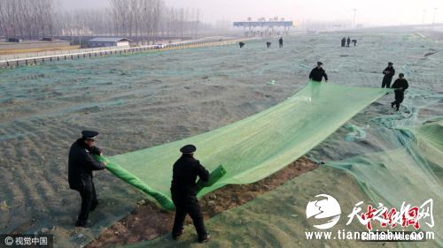 12月16日,北京大兴区城管队员正在苫盖建筑垃圾。图片来源:视觉中国