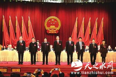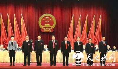 新一届市人大常委会领导班子成员(从左至右):段迎存、席飞跃、孙晓钢、张建平、曹丕玉、李虎林、朱宗礼、刘怀君。