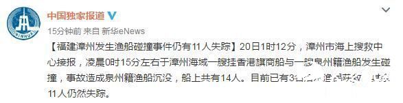 福建漳州发生渔船碰撞事件 目前11人失踪 2016-12-20 12:31 我要评论0 人民网北京12月20日电据新华社对外部微博消息,20日1时12分,漳州市海上搜救中心接报,凌晨0时15分左右于漳州海域一艘挂香港旗商船与一艘泉州籍渔船发生碰撞,事故造成泉州籍渔船沉没,船上共有14人。目前已有3名落水渔民获救,其余11人仍然失踪。 微笑 流汗 难过 羡慕 愤怒 流泪 相关阅读 关键词: 北京 首都 房价 复制网址 打印 收藏 0
