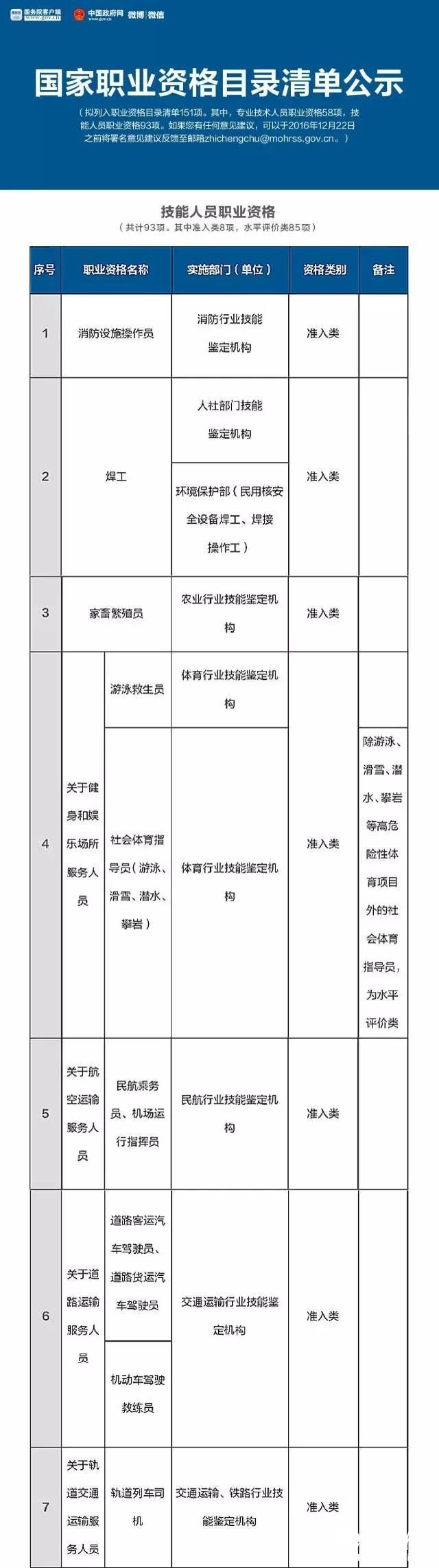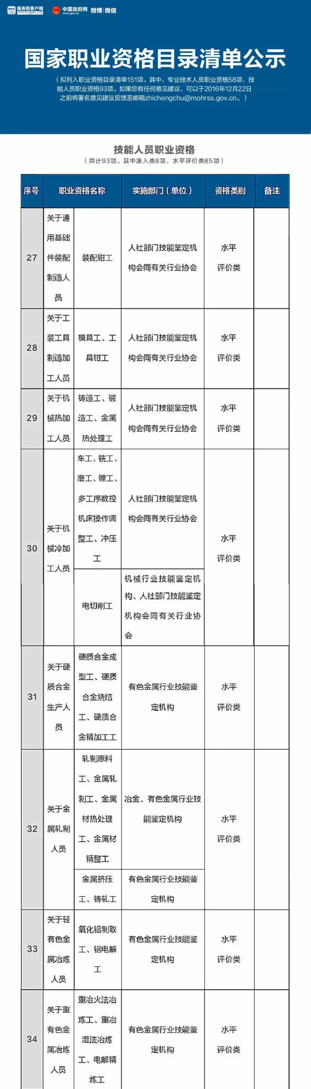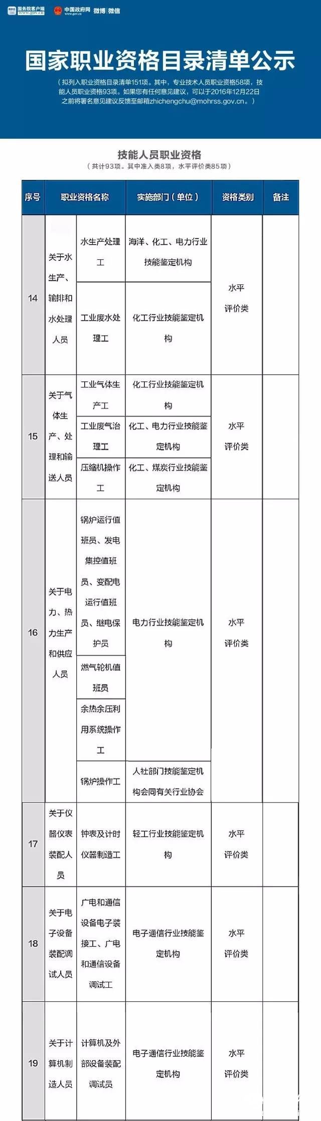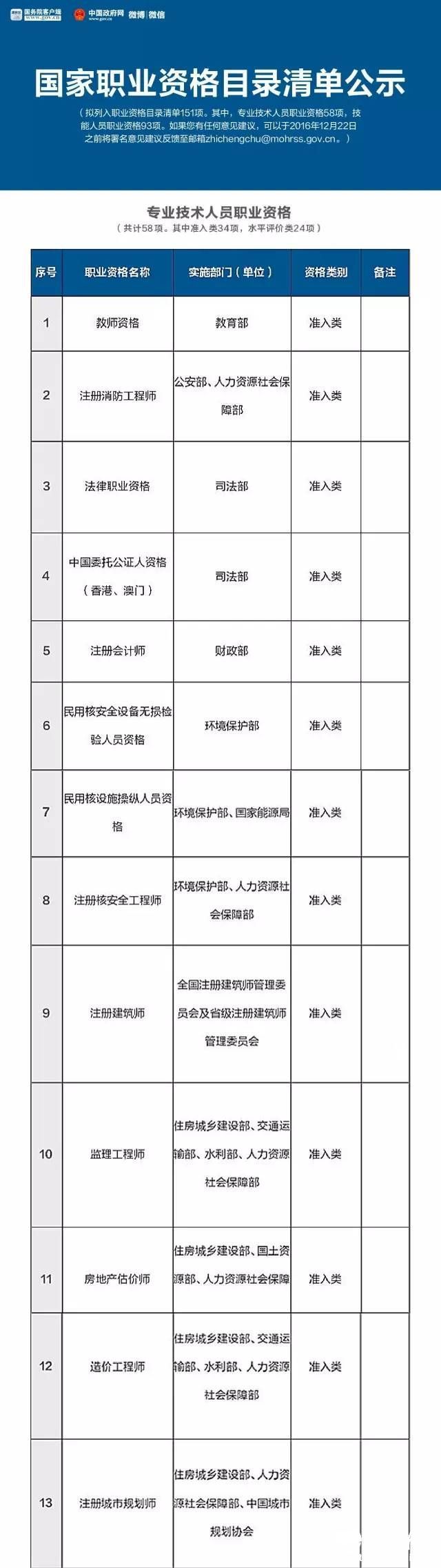 就在这个月的16号,人力资源和社会保障部公示了国家职业资格目录清单,拟列入职业资格目录清单151项。其中,专业技术人员职业资格58项,技能人员职业资格93项。