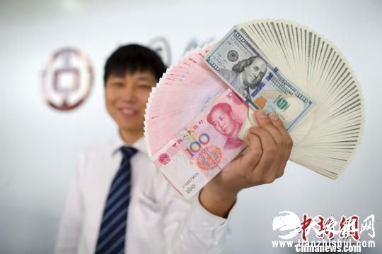 资料图:山西太原银行工作人员正在展示人民币、美元。张云摄
