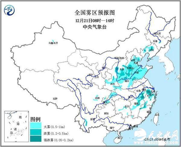 中国天气网讯中央气象台12月21日06时发布大雾黄色预警: