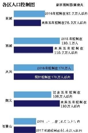 上周起,北京市16个区“两会”陆续开幕,政府工作报告中,人口“天花板”成为了各区政府近两年工作重点之一。截至昨日,共有东城、西城、大兴、石景山、顺义5个区在近期开幕的“两会”中,公布了各自未来人口调控“上限”。其中,西城区、大兴区和顺义区的调控计划在百万级以上,西城区的目标是110.7万人,大兴区和顺义区的目标为170万人和130万人。剩下两区的指标在60万至80万之间,东城区计划到2021年常住人口规模比2016年下降13%左右,控制在76.2万人以内;石景山区则明确,2017年底全区常住人口控制在61.6万人以内。