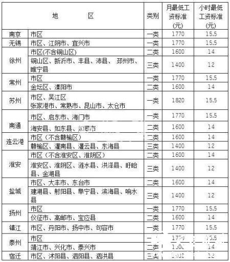 记者了解到,2016年元旦起,江苏省上调了最低工资标准。其中,月最低工资标准:一类地区1770元,增加140元;二类地区1600元,增加140元;三类地区1400元,增加130元。