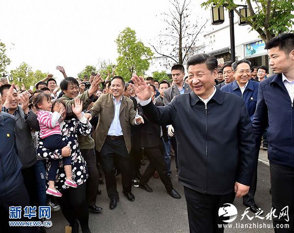 图为:2016年4月24日至27日,中共中央总书记、国家主席、中央军委主席习近平在安徽调研。这是4月25日下午,习近平在滁州市凤阳县小岗村向村民们问好。