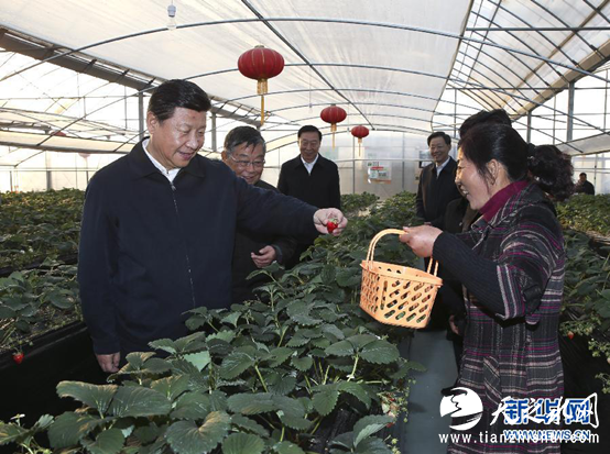 图为:2014年12月13日下午,习近平在镇江市丹徒区世业镇先锋村农业园草莓大棚,实地察看草莓生长情况。
