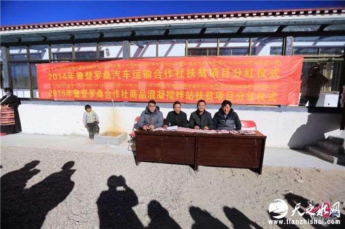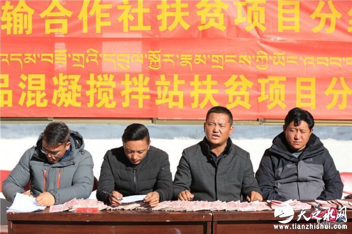 记者来到羊八井镇时,空地上人头攒动,一条红幅映入眼帘,上面写着“2014年鲁登罗桑汽车运输合作社扶贫项目分红仪式”和“2015年鲁登罗桑商品混凝搅拌站合作社扶贫项目分红仪式”,近百名群众手持精准扶贫精准脱贫建档信息登记表排成两队,条幅下面一排长桌,一沓沓人民币摆放整齐。原来记者正好赶上羊八井镇举行的合作社扶贫项目分红仪式。