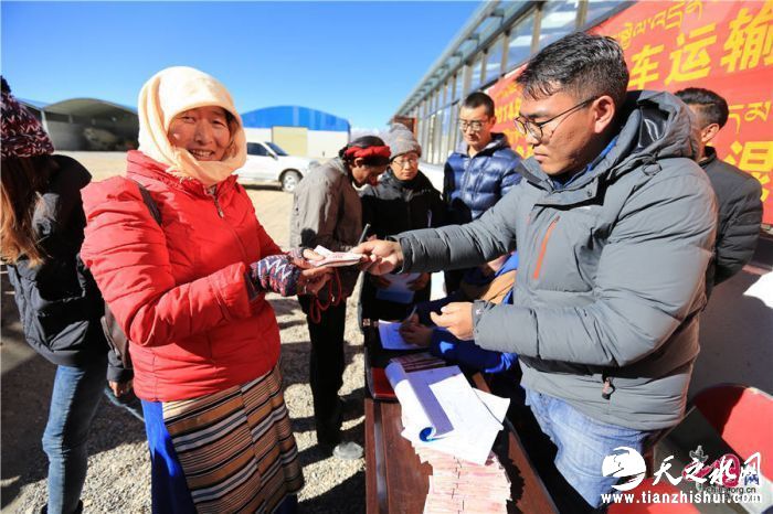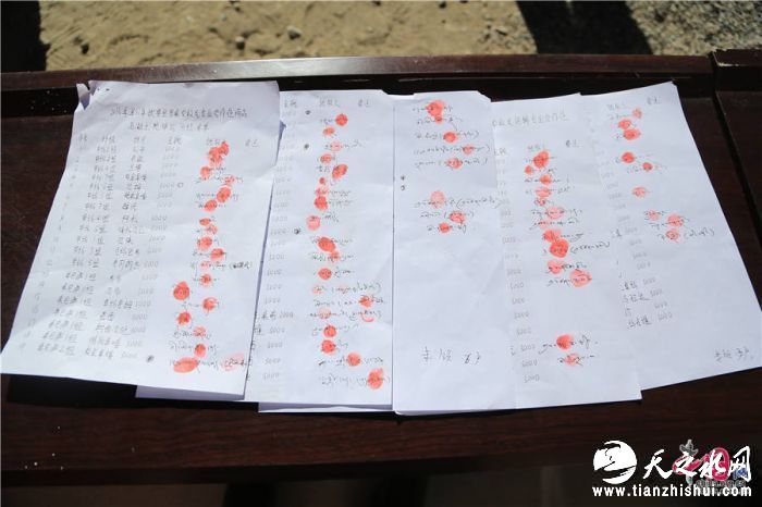 站在头排的是一位藏族老大爷,身着一身传统的白色藏族服饰,戴着一顶破旧的毡帽,手持信息登记表,长满皱纹的脸上,不时露出幸福的笑容。只见他走到课桌前,把登记表放在桌子上,工作人员为他签上字,他用食指蘸上红印油用力地按在纸上,工作人员把精准扶贫分红款3000元人民币交在他的手里,同时还为他敬献哈达。