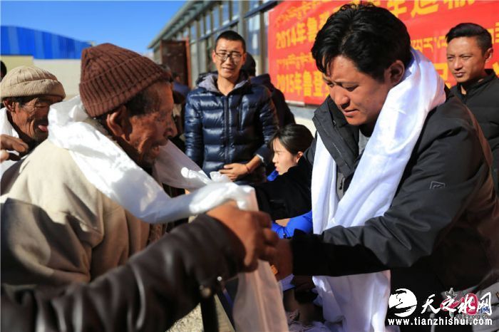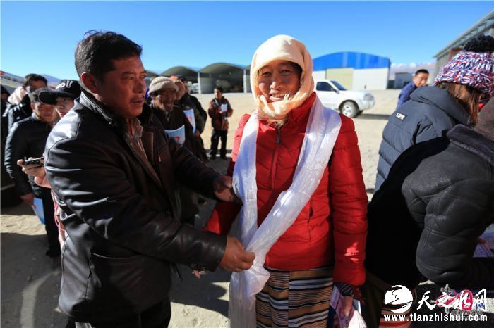 图为工作人员向贫困户敬献哈达。王东海 摄
